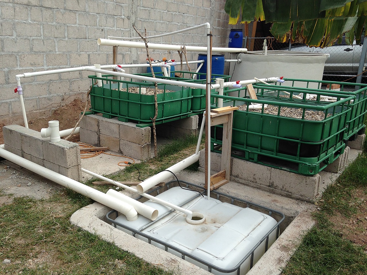 We use an integrated fish and plant system known as aquaponics that recycles the water from the fish to the plants and back again. We are following the design by the Food and Agriculture Organization, FAO, for a media bed system in developing countries found in their technical paper 589, "Small-scale aquaponic food production, Integrated fish and plant farming."